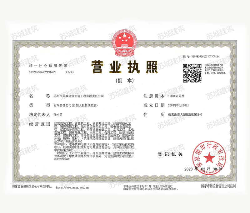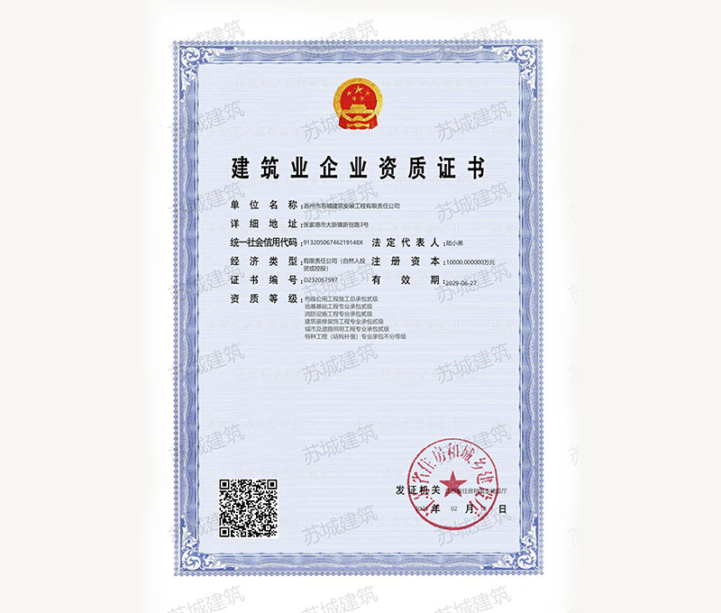 蘇州市蘇城建筑安裝工程有限責任公司,擁有主項建筑工程施工總承包一級資質,增項市政公用工程施工總承包二級資質和建筑裝修